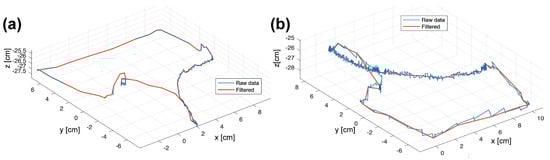 Furthermore, position filtering based on two subsequent point variations was designed as follows. Experimental results show that the change of P is greater in the z component compared to both x and y components, at each data collection iteration. Hence, the filter neglects data with large variation in the z component. To complement the filter, it was decided to be selective in the minimal distance between the last P point and each P point registered. Both observations were done while the tool was not moving and in the vertical position. A repeatability test was carried out to validate the accuracy of the measured distances. Lines of 1 to 11 cm were drawn in the x–y plane and gauged via a digital caliper model Absolute Digimatic with resolution of 0.01 mm (Mitutoyo®, Kanagawa, Japan). Ten measurements were needed to obtain the mean standard deviation of the system.