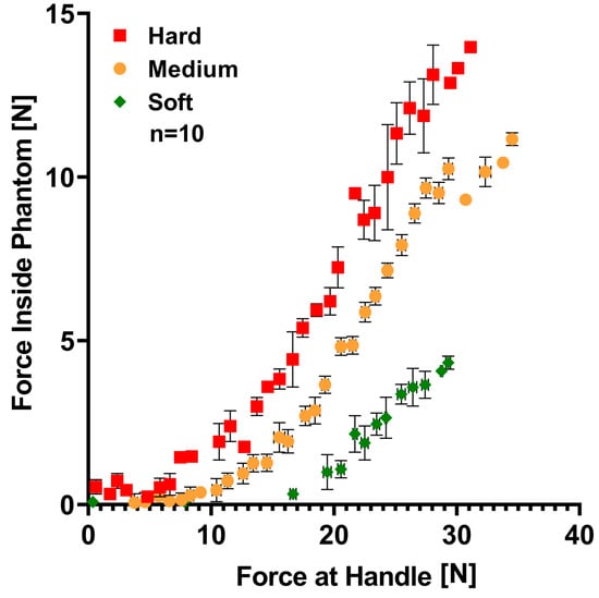Different mixing ratios were used to manufacture hard, medium, and soft PDMS phantoms. Resulting differences in phantoms are shown in Figure 8, where the average gripping force module and phantom force of ten measurements, along its respective standard deviation, are graphed. This different behavior is due to the variation in stiffness []. Thus, as stiffness increments, phantom deformation decreases when a load is applied over it. Consequently, the transmitted force is higher, measuring greater values inside the phantom; opposite behavior is observed to softer samples, where forces sensed inside phantom are smaller for the same load. Differences in phantoms resulted significant (p < 0.01).