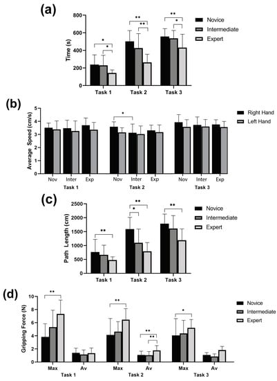 Results of the training tasks (N = 39, bars represent mean ± standard deviation, asterisks represent statistical significance * p < 0.1 ** p < 0.05). (a) Total time needed to complete each task. (b) Average speed of both instruments (left and right hand) during the tasks. (c) Total distance covered by both instruments (left and right hand). (d) Average and maximum grasping force applied during the tasks.