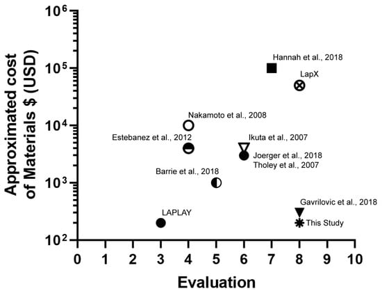 To compare the affordability of the proposed simulator, Figure 10 provides a cost-comparison to a wide range of training simulators currently in the market and research prototypes. The “current study” refers to the cost of our simulator components (not including the standard laparoscopic surgery instruments). We considered the commercial systems Lap-X (Medical X, Rotterdam, The Netherlands) and LaPlay (Jinan One Half Industrial Design, Shandong, China) box trainers with haptic force feedback and no force feedback, respectively; as well as a proposal from Tavakoli et al., a system based in photonic crystal fiber sensor; proposals of Barrie et al. and Hannah et al., both based on force sensing at the handle; and Tholey’s proposal, with the grasper-tip instrumented and hydrogel phantoms [,,,,,]. Moreover, some researchers employ specialized and costly devices to measure the position and orientation of the laparoscopic instrument. Other researchers use specialized software for computing the instrument’s position [,,], and an approach with similar features made by Gavrilovic et al. []. A benchmark comparison was conducted qualifying each system in a scale from 1 to 10 based on desired and useful features. The reference features used in this benchmark comparison are the following: (a) compatibility with standard surgical instruments, (b) need to modify surgical instruments, (c) portability, (d) need for wearable devices, (e) compatible with real surgery, (f) 4 DOF, (g) visual feedback, (h) haptic feedback, (i) surgical instrument tip tracking, (j) tracking of gripping force.