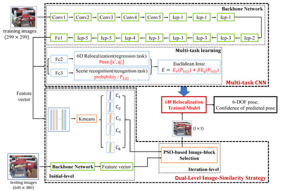 The block-diagram of our methods. The main idea is to crop a testing image into several image blocks, and find the image block with the highest similarity to training set. Firstly, we train our multi-task CNN, thereby obtaining a 6D relocalization trained model. The trained model is used to extract the feature of the image, which forms a feature vector. Secondly, to reduce the computational complexity of image similarity, feature vectors of training images are clustered by k-means. Thirdly, the cropped position of the image, which is regarded as the optimal variable, is optimized by PSO-based image-block selection. Finally, the pose and confidence of predicted pose can be obtained by utilizing 6D relocalization trained model to calculate the selected image block with the highest similarity.