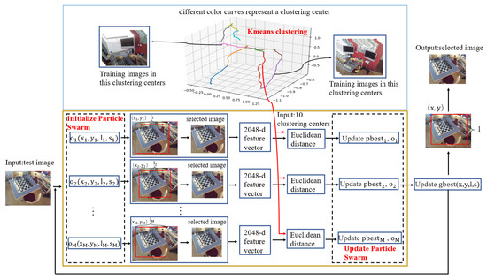 Then, it was found in [3] that if the trajectory of the training set and the trajectory of the testing set are visually similar, the relocalization performance will be better on the testing set. However, the method in [3] has a limitation: the cropped positions of the image cropping algorithm based on genetic algorithm are fixed. Thus, the cropped image may not be the one that is most similar to the training set. Based on this, we propose the PSO-based image-block selection algorithm, using random particle swarm to determine the cropped position. The image similarity between the testing image block and training images is treated as the fitness function. Our CNN is considered as a feature extractor and the extracted feature vectors can be utilized to calculate image similarity. Meanwhile, we found that if we use all training images to calculate image similarity with the testing image, the computational complexity becomes high. We use k-means to cluster feature vectors of training set to reduce the computational complexity, making our network operate in real time. Thus, the Euclidean distances between feature vectors of the testing image and feature vectors of clustering centers are used as measurements of image similarity. Finally, we integrated our methods and propose a preprocessing system of testing images: dual-level image-similarity strategy. After we get the testing image block, we transmit it into 6D relocalization trained model to get the 6DoF pose and the probability that the image belongs to the current scene. We regard the probability as the confidence of the predicted pose. The entire process is shown in Figure 1.