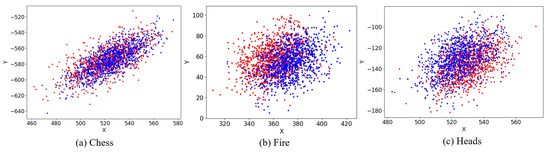 We take a sequence in the Chess, Fire and Heads dataset of 7Scenes to illustrate why we can use one backbone CNN for both pose regression and scene recognition. We use two GoogLeNet Inception V3 networks to analyze the problem, one of which is responsible for image pose regression while the other is used for image recognition. Two networks can output their own corresponding feature vectors respectively through their last layer, and we use t-SNE to visualize the two output vectors in Figure 5. In Figure 5a–c, we get the projection points on the two-dimensional plane, which are corresponding to the outputs given by the last layer of the two networks, and it is found that the overall convergence position of the projection points is almost the same, suggesting two networks learn almost the same feature representation in the low-level layers. This further indicates that the CNN which is used for classification will always store the pose information until the last layer, no matter whether it will be expressed in the output, which illustrates that it is feasible to use single CNN to learn both pose regression task and scene recognition task.
