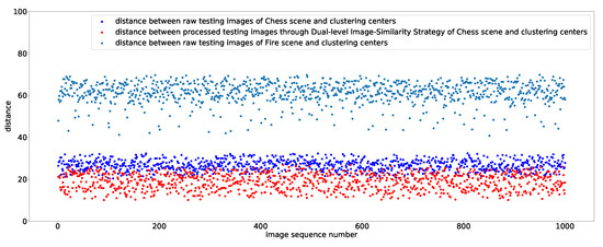 The Euclidean distance is used as a measurement of image similarity to get the image which is most similar to the nearest neighbor training image. Figure 8 shows the distance between three types of testing images and clustering centers of the training images in Chess scene. Figure 8 indicates that the distance between testing images of Chess scene and clustering centers of Chess scene becomes close, which shows that through DLISS we can always get the image block with the highest similarity to training set. Meanwhile, for testing images of Fire scene, the distance between most testing images and clustering centers of Chess scene exceeds the distance threshold, so the proposed algorithm will not process these images, which makes algorithm more robust. In Figure 8, we can see that there are still some testing images that have not been eliminated by the algorithm, and these images will be sent to the network for pose regression. However, the scene recognition of our multi-task CNN will give a particularly low confidence for the predicted pose of these images, which indicates that our algorithm and scene recognition can solve the problem of model uncertainty together.