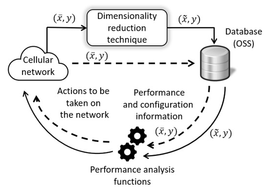 In a cellular network, performance information is monitored and periodically stored in a centralized database: the OSS database (see dashed lines in Figure 1). This information usually takes the shape of service or network performance metrics (such as KPIs), as well as user call traces, and may be expressed as a set of N-dimensional samples, , being N the number of the monitored metrics, that is, the number of features. A feature could be, for example, the number of user connection attempts registered by a base station in a given time period. Usual values for N (several thousands), together with the high number of network elements simultaneously monitored, entail the storage of a huge amount of performance data every day and pose a performance issue for subsequent fault diagnosis functions. Together with , a possible additional label, y, often referred to as the ground truth label, may be attached. This label corresponds to the network state under which each sample was gathered. A ground truth label could be a coverage hole, a problem of interference, or a network overload. The availability of this label allows using supervised techniques for dimensionality reduction [3,5] and supervised techniques for automatic diagnosis [12,13], whereas its lack forces network experts to only use unsupervised techniques for both dimensionality reduction and RCA functions [2].