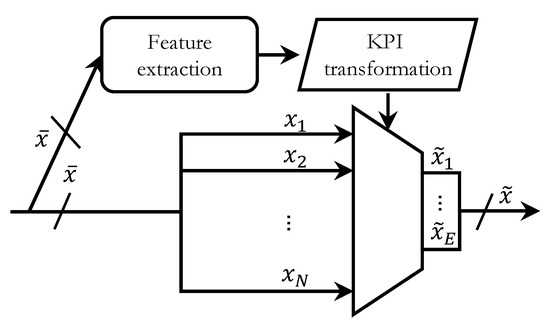 In the context of cellular networks, this means that a new set of synthetic KPIs are built upon the combination of the original ones retaining as much information as possible. Therefore, a feature extraction technique is a process that transforms an element , defined by the features , in an element , defined by the features , where each new feature comes from the combination of several features of . Even though may have any number of dimensions, in general, it is preferred that , thus making contain the information of in a lower number of dimensions. A scheme for feature extraction is shown in Figure 2. In this case, given that the vast majority of feature extraction techniques is unsupervised, only is used as its input. The result is a model for KPI transformation that may differ depending on the particular technique being used. For example, it may consist of a matrix describing how the indicators at the input are linearly combined to produce the synthetic ones. It may also describe nonlinear functions to be applied over the former to get the latter. In any case, the resulting output takes the form of : a vector with less dimensions that and which is comprised of features to . The tilde in to highlights the fact that these features are different from those at the input, not being a subset of the latter, such as would be the case in feature selection techniques.