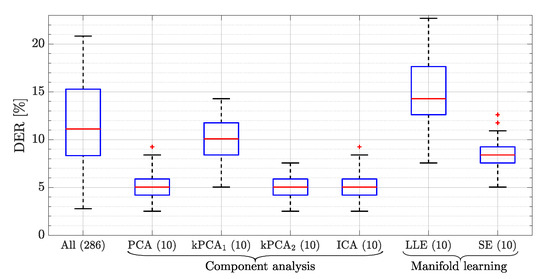 A test has been carried out to evaluate the performance of the considered feature extraction techniques in the field of fault diagnosis. In the experiments, a dataset from a live LTE network with 359 samples has been used [20]. The methodology and analysis proposed in this paper can be easily applied to a 5G network when a proper dataset is available. Each sample is composed of 286 RAN KPIs and a ground truth label, indicating the network state under which the sample was collected. In particular, four different labels are differentiated: high traffic, no traffic, high CPU utilization, and low coverage. As described before, the comparison among the selected feature extraction algorithms is made by evaluating the DER obtained in a subsequent diagnosis stage. The inputs used in the diagnosis stage are the synthetic KPIs computed by each feature extraction technique. DER is defined as the ratio of problematic cases diagnosed with a different label from the real one (misclassified cases), , to the total number of problematic cases, , as shown in the following expression: