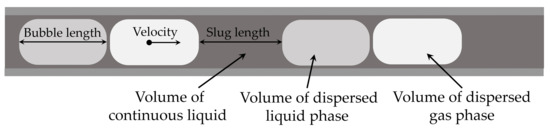 Figure 1 depicts the variables to be controlled in slug flow. It should be noted that the dispersed phase bubbles are enclosed by the better wall-wetting continuous phase, which usually forms a thin wall film. In this work, the continuous phase is also considered as a slug, the length of which can be measured. The wall film must nevertheless be taken into account if a volumetric flow rate is to be determined from the velocity. For this purpose, existing models for the thickness of the wall film can be applied to calculate the volumetric flow rate, which is useful, for example, if a pump is to be controlled [
