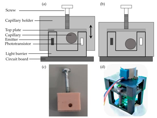 Figure 4c, a photo of the three-dimensional (3D) printed holder made of polylactic acid (PLA) is shown. A recess is provided inside the capillary holder, the dimensions of which are selected so that the transmissive sensor unit can be completely embedded in the capillary holder. At the lowest position, it rests on the circuit board. A small top plate is attached on top of the transmissive sensor unit, which prevents the adjusting screw from protruding between the emitter and detector. In addition, this plate distributes the load evenly between the emitter and detector housings. The capillary holder contains a hole through which the capillary is passed and, thus, fixed in space. This hole is placed in such a way that, when the screw is completely unscrewed, the capillary is located at the bottom of the transmissive sensor. The decision with respect to the horizontal positioning of the capillary close to the transmitter is based on the theoretical consideration that the aperture in front of the detectors has the greatest effect when the capillary is positioned directly in front of the aperture. For detailed analysis of capillary position, a capillary holder together with a step motor (