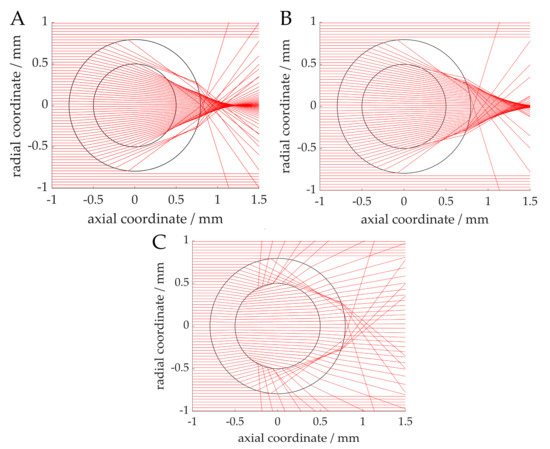 Figure 9A), a slight deflection of the rays can be observed. The deflection at the level of the bubble cap results in a minimum in the signal, since, at this point, less light transmission can be measured than before and after the bubble. In this case, the light focusing further to the right of the cap explains the maxima of the signals. In the case of the nitrogen bubble (