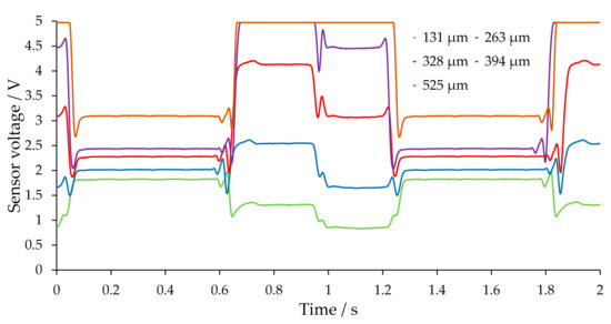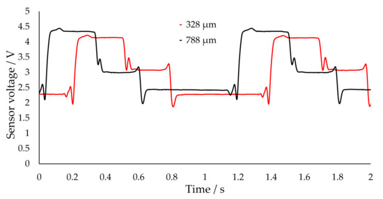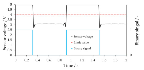 Figure 7, 525 µm), which presents the differentiation between gas and liquid, as in a biphasic flow. The limit value can, for instance, be the average value of the two-phase plateaus. A high measuring frequency together with measurement noise can lead to a limit value being exceeded several times within a short period. A filter is, therefore, used to smooth out the measured signal. In this particular case, a moving average filter was used. The number of averaged values is set depending on the measuring frequency. At a measuring frequency of 9600 Hz, for example, the last 128 values (corresponding approximately to the values of the last 13.3 ms) are averaged.