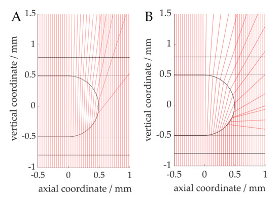Simulations of the light beams through the capillary lead to light refraction, as shown in