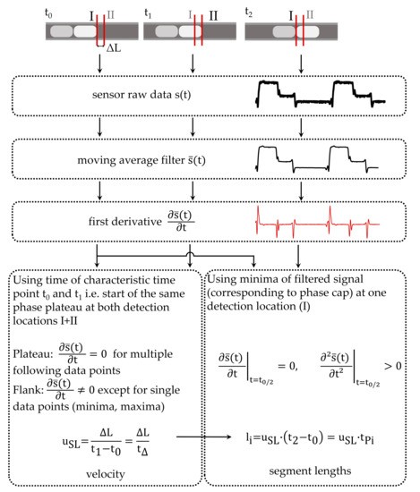 Pi, which is needed for the phase length calculation (Equation (2)), the time between the two minima surrounding a plateau is utilized. The minima can be derived from the first derivative. However, the derived slug or bubble length has to evaluated for a new substance system since the cap shape may change. In this case, other characteristic points in the signal may also be used to obtain an appropriate slug/bubble length value.