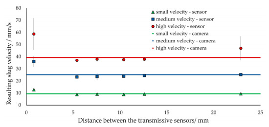 The transmissive sensor distances between 5 and 12.5 mm show good agreement with the actual flow velocities at all overall volumetric flow rates. For the largest spacing of 23 mm at high volumetric flow rates, a large deviation can also be detected. This is due to the fact that the estimation of the velocity via the first two transmissive sensors with a small gap between them is not sufficiently precise to track the slug or bubble observed up to the third transmissive sensor.