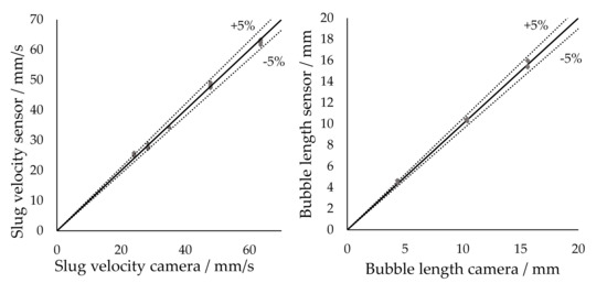 An important factor influencing the measuring accuracy of the method presented is the distance between the photoelectric sensors. If this distance is too short, even the smallest fluctuations in the flow velocity can cause a large measurement error. If the distance is too large, one must ensure that the segments can be tracked correctly, since several bubbles and slugs may be located between both sensors. For this reason, several distances between the transmissive sensors were chosen and the resulting velocities were compared with camera recordings. The smallest distance is 0.8 mm, which is determined by the dimensions of the double transmissive sensor unit (TCUT1300X01, Vishay). With a second transmissive sensor, greater gaps can be realized. When the spacing between the transmissive sensors is larger than a phase triplet, a third transmissive sensor is used. This is placed at the minimum distance (0.8 mm) to the first transmissive sensor, so that an approximate velocity of the flow can be captured. With the distance to the third transmissive sensor, the time can be estimated when the slug or bubble observed flows into the third transmissive sensor; hence, a phase segment can be followed over several millimeters. Thus, spacings between the transmissive sensors of 0.8–23 mm were compared. The methods described in