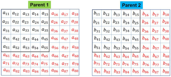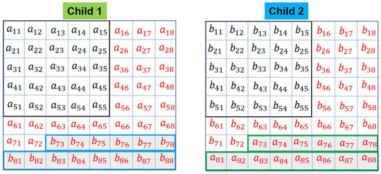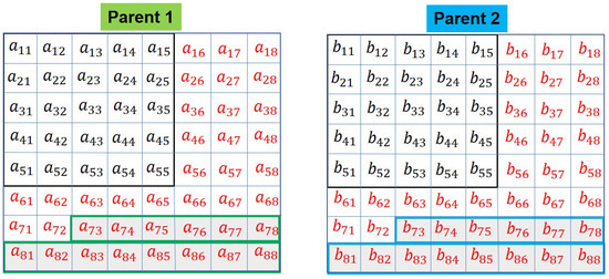According to the Algorithm 2, the random integers and are obtained as . The selected elements around the crossover point are shown in the shaded area with a green outline in Parent 1 and blue outline in Parent 2. They are shown in Figure 10.