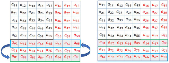 function is given in Algorithm 3. It swaps and rows of a chromosome. The pictorial representation of the operation is given in Figure 12. The algorithm is explained with the help of an example. Let us consider, , and . The selected rows are shown in green and blue lines, respectively. According to the algorithm, the sixth and eighth rows are swapped, as shown in the figure.