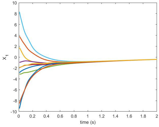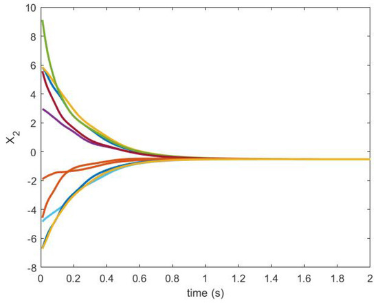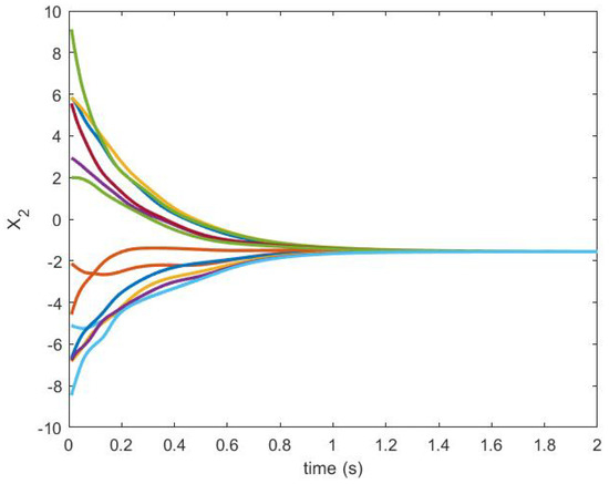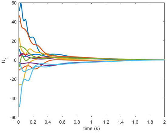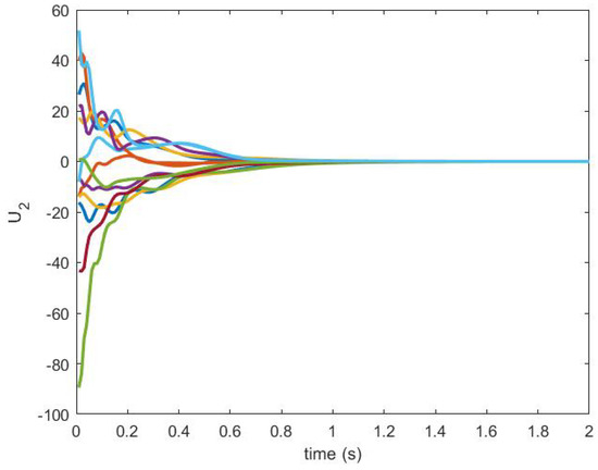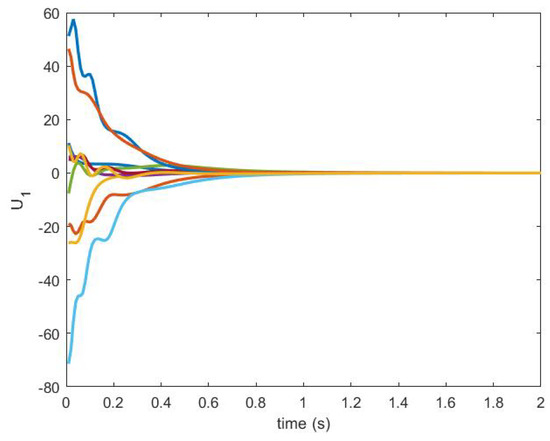 The consensus is achieved by using the NDI-based controller. The control signals and are shown in Figure 16 and Figure 17, respectively.