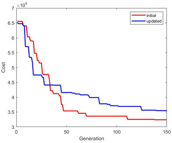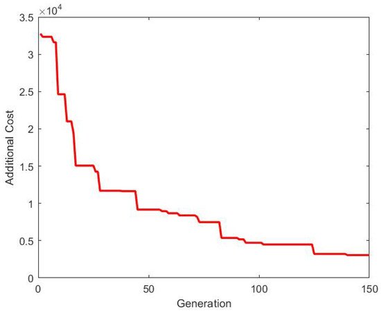 It is obvious that the addition of new agents result in an increase in the consensus control energy. The objective of this paper is to minimize the additional control energy. The cost produced by 2D-GA to obtain the updated topology is compared with that of the existing topology in Figure 21. Also, the additional cost required to obtain the updated topology is shown in Figure 22.