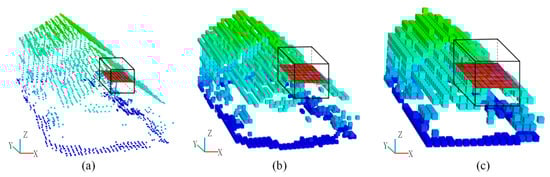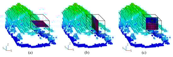 Note that the aforementioned feature maps are derived by projecting the point cloud into X-Y plane. Figure 4a shows the feature map with a grid size of S1 based on the projection plane of X-Y plane. In addition, other two feature maps are then generated by projecting the point cloud to Y-Z plane and X-Z plane by using the feature map projection method described in Section 2.2.2, as shown in Figure 4b,c. In the method of Zhao et al. [], they rotated the point cloud with two small angles to generate multi-view feature maps. In our method, we project the voxelized point cloud into X-Y, Y-Z, and X-Z plane for the generation of multi-view feature maps, which can derive a more accurate description of each 3D point.