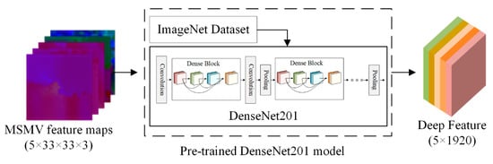 In order to obtain a well-trained deep neural network, a large number of training samples are usually required and many parameters need to be tuned in this process. To solve these problems, scholars began to apply the transfer learning method for point cloud classification. In transfer learning, it is critical to choose an appropriate pre-trained neural network, which can extract deep features with good generalization performance []. The well-known network-based transfer learning model includes AlexNet, VggNet, and ResNet which are commonly used in various classification tasks []. Zhao et al. use the ResNet50 model pre-trained on ImageNet to extract the deep features []. In this paper, we use DensNet201 model instead of ResNet50 model to extract deep features, because the pre-trained DensNet201 model achieves better performance in the following classification task. This can be explained that the dense connection and feature reuse of DenseNet can extract deep features more efficiently. Meanwhile, the ImageNet dataset can also provide data guarantee for transfer learning []. As shown in Figure 5, the feature maps (5 × 33 × 33 × 3) generated in Section 2.2 are fed into the pre-trained DesNet201 model to generate the multi-scale and multi-view deep features (5 × 1920).