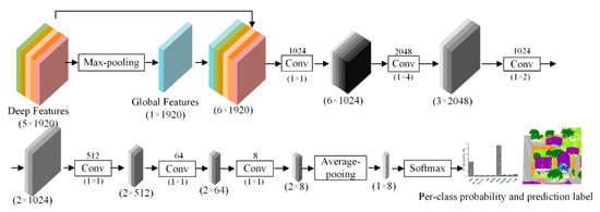 Multi-scale and multi-view deep features derived from the pre-trained DenseNet201 model have a good generalization ability, which is critical to improve classification accuracy. Based on these deep features, a classifier is often needed for subsequent point cloud classification. In this paper, an improved fully convolutional neural network was designed to carry out the classification task. Compared with the fully-connected layer, the convolutional and pooling layers can effectively conduct data mining, reduce computing cost and increase classification accuracy [,]. We designed a fully convolutional neural network with convolutional and pooling layers for the classification of ALS point cloud, as can be seen from Figure 6. First, the deep features derived from pre-trained DenseNet201 model (5 × 1920) were used to generate the global features (1 × 1920) by the max-pooling operation. Second, the combined features (6 × 1920), which were formed by global features and deep features were fed into multiple convolutional layers with different convolutional kernels to learn high-level features (2 × 8). After that, the average-pooling layer was used to derive the final feature of each object (1 × 8). Finally, a softmax layer was used to obtain the per-class probability of each point and the prediction label was obtained.