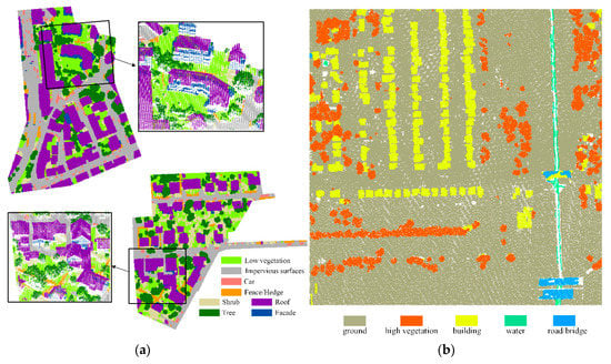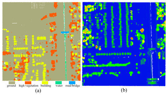 International Society for Photogrammetry and Remote Sensing (ISPRS) dataset: (a) training dataset displayed by label, (b) testing dataset displayed by intensity.