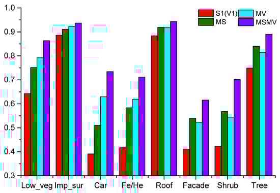 In order to verify the impact of multi-view and multi-scale features on the classification results, we performed experiments using four configurations: (1) using the single scale feature with a grid size of 0.1 m for classification, based on that we project the point cloud into X-Y plane (V1/S1); (2) using multi-scale features with grid sizes of 0.1 m, 0.3 m and 0.5 m for classification, we project the point cloud into X-Y plane (MS); (3) using multi-view features by projecting the point cloud into X-Y, Y-Z and X-Z plane for classification set the grid size as 0.1 m (MV); (4) using the multi-scale and multi-view features for classification (MSMV). Figure 10 shows per-class F1 score of the aforementioned four configurations.