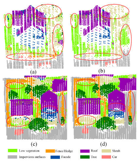 As shown in Table 2, the overall accuracy with graph-cuts optimization is 1.88% higher than N-GC. The F1 scores of all class have been increased, which indicate that the graph-cuts is effective for refining the point cloud classification result. Note that there are noise points in the classification result of transfer learning, as can be seen from Figure 11a,c. In the areas marked by red ellipses in Figure 11a,c, there are scattered misclassification points of shrubs and trees, fences and trees, etc. These misclassification points have been identified as the correct category after graph-cuts optimization, which can be seen in Figure 11b,d.