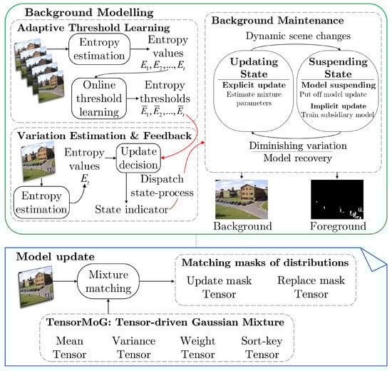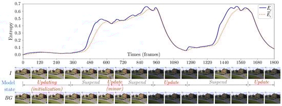 Next, at every time step t, we calculate an entropy estimation to evaluate the stability of the current background model, as shown in the left portion of the top picture in Figure 1. Here, we incorporate an online adaptive learning strategy for scene variation threshold while using the value along with past entropy estimations. This acts as the signaller when the model enters a period when background prediction is influenced enormously, such as sudden illumination changes, where the values and are compared and a decision is drawn.