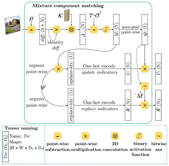 A model of N Gaussian components is required at each pixel within in order to examine intensity distance; so, we need to broadcast input frame to fit into the distribution-plane of the mean tensor. Equation (4) denotes that element-wise estimation is performed in the domain of tensor maps, while using convolution with , an all-ones vectorized kernel. We apply a threshold-based activation function in order to produce matching mask denoted , which indicates distributions matching its corresponding values. Using , which is summarized from , denotes whether or not a pixel location can potentially have its current MoG state matched. In order to have a good grasp of the importance of a component in the mixture, we use a different treatment of weight updates with a ratio of in terms of a sort-key tensor . This is the manner of weighting components within a mixture at each pixel by valuing high-weighted, low-spread distributions in the mixture, thereby spotlighting the most significant distribution that contributes to the construction of backgrounds.