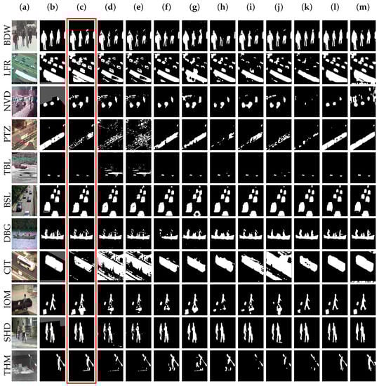 Visual quality comparison for foreground detection on some of video sequences in eleven categories from CDnet 2014. The columns include (a) input frame, (b) corresponding groundtruth foreground, (c) TensorMoG, (d) GMM—Stauffer & Grimson, (e) GMM—Zivkovic, (f) SuBSENSE, (g) SWCD, (h) PAWCS, (i) FTSG, (j) BMOG, (k) DeepBS, (l) FgSegNet_v2, (m) Cascade CNN.