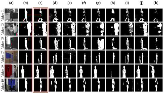Visual quality comparison on six video sequences of camouflaged moving foreground detection in CAMO-UOW dataset. The columns include (a) input frame, (b) corresponding groundtruth foreground, (c) TensorMoG, (d) GMM—Stauffer & Grimson, (e) GMM—Zivkovic, (f) LOBSTER, (g) SuBSENSE, (h) SJN-Multiclue, (i) IMBS, (j) PBAS, (k) PAWCS.