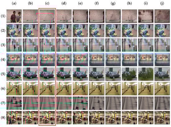 Visual quality comparison for background modelling on video sequences in SBI dataset. Some of SBI sequences: (1) sequence Board, (2) sequence Candela_m1.10, (3) sequence CAVIAR1, (4) sequence CAVIAR2, (5) sequence Foliage, (6) sequence HallAndMonitor, (7) sequence HighwayI, (8) sequence HumanBody2. The columns include (a) input frame, (b) groundtruth, (c) TensorMoG, (d) GMM—Stauffer & Grimson, (e) GMM—Zivkovic, (f) LOBSTER, (g) SuBSENSE, (h) IMBS, (i) DeepPBM, and (j) PAWCS.