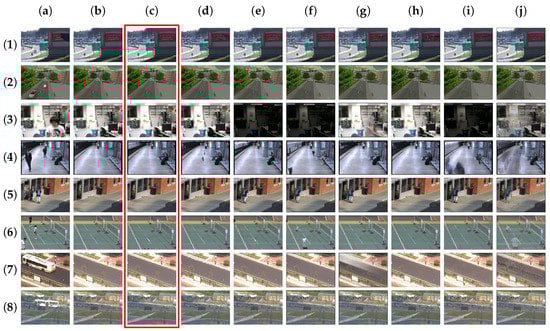 Visual quality comparison for background modelling on video sequences in SBM dataset. Some of SBM sequences: (1) background motion: sequence advertisementBoard, (2) basic: sequence 511, (3) illumination changes: sequence CameraParameter, (4) intermittent motion: sequence AVSS2007, (5) intermittent motion: sequence busStation, (6) jitter: sequence badminton, (7) jitter: sequence boulevard, (8) very long: sequence BusStopMorning. The columns include (a) input frame, (b) groundtruth, (c) TensorMoG, (d) GMM—Stauffer & Grimson, (e) GMM—Zivkovic, (f) LOBSTER, (g) SuBSENSE, (h) IMBS, (i) DeepPBM, and (j) PAWCS.