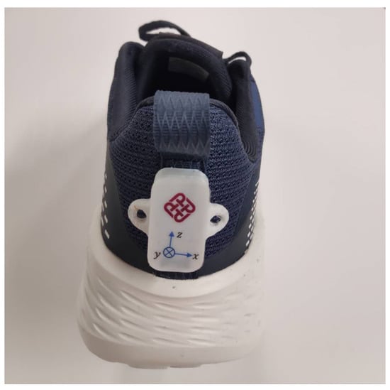 The placement and orientation of the inertial measurement unit (IMU) on the posterior heel region.