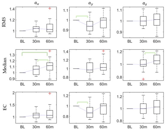 The root mean square (RMS), median, and energy consumption (EC) of accelerations at baseline, 30th min, and 60th min. Bracket denotes statistical significance (p < 0.05) in the post hoc analysis with Bonferroni correction.
