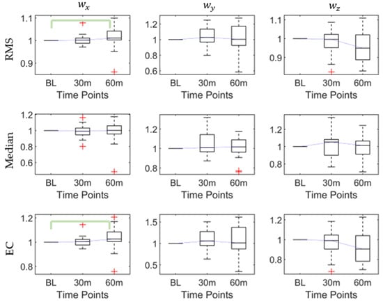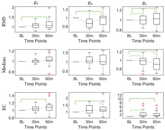 As Table 2 shows, there were significant differences in the RMS (p < 0.03), maximum (p < 0.03), and EC (p < 0.02) of the x-axis angular velocity, while there was no significant difference in the y-axis and z-axis angular velocities. The post hoc pairwise comparison test (Table 3) proved that the significant differences in the RMS, maximum, and EC exist at the baseline and 60th min, which all increased after 60 min. The post hoc results of the RMS, median, and EC characteristics of the three axes’ angular velocities are shown in Figure 3.