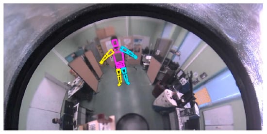 With regard to the state of the art, many research works have been developed for 3D human pose estimation. They can be classified into two main categories: model-based and non-model-based methods. In so-called “model-free” approaches, machine learning techniques [2,3] are often used to estimate a statistical model formalizing the relationship between the human body appearance in images and its 3D posture in the real world. However, this mapping function remains difficult to compute due to the large variability of the articulated human appearance model. With the advent of deep neural networks, significant progress has been made in monocular 3D human pose estimation. Li et al. [4] used a convolutional neural network (CNN) to directly estimate the 3D pose from the image. Tekin et al. [5] use an auto-encoder to learn the pose representation in high dimension and to regress 3D poses from 2D images. Pavlakos et al. [6] proposed a method for fine discretization of the 3D pose by considering the problem as a 3D key point location issue. Then, they used a coarse-to-fine prediction method based on several convolution layers to progressively refine the initial estimates. Other studies have focused on the transition from 2D to 3D. For example, Zhou et al. [7] expressed the optimization problem as the relationship between 2D pose and 3D geometric features, and predicted the 3D pose using an expectation maximization algorithm. Fang et al. [8] have developed a pose grammar to refine the 3D pose using a bidirectional RNN designed to explicitly incorporate a set of knowledge about the human body posture. Chen et al. [9] used the nearest neighbor search method to determine the correspondence between the estimated 2D and 3D poses in a large library of poses. Other works [10,11] adopt adversarial learning to encourage the deep network to acquire plausible human body postures. More recently, Chen et al. [12] present an unsupervised learning approach to generate 3D postures from 2D joints; this approach does not require 3D data but uses geometric self-monitoring as a constraint to learn the 2D-3D lifter. In addition, Habibie et al. [13] propose a deep learning-based architecture for 3D human pose estimation that encodes explicit 2D and 3D features, and uses supervision by a new projection model learned from the predicted 3D poses. Despite the interest in deep convolutional networks, their use in our case would not be appropriate. Indeed, the implementation of deep learning-based solution would have required a large amount of training spherical images with 3D pose annotations. However, to our knowledge, this kind of image dataset does not exist, and the construction of such one requires a lot of time and resources involving a very high cost. In addition, using available perspective image databases during the learning phase will certainly worsen the 3D pose estimation for an omnidirectional input image. Indeed, the intrinsic characteristics of spherical and perspective images are not the same and cannot be correlated in the same way. Furthermore, the “model-based” approaches require an approximation of the real geometry and the movement of the human body. In the literature, different geometric models have been used to represent the human body: articulated model, truncated cylinder, conical, etc. The mechanical and kinematic constraints associated with the human body movements during its displacement are often integrated into the pose estimation process in order to reduce the solution space and thus improve robustness and accuracy. In [14,15] the authors use a “Flexible Mixtures of Parts” [16,17,18] detector to localize in the current image the person’s 2D silhouette. The 3D tracking in the real environment is then determined thanks to a linear regression approach. Moreover, the use of catadioptric cameras for 3D tracking remains very limited despite the many advantages they offer. Many research studies have focused on the development of a specific mathematical model of creating an omnidirectional image while taking into account the particular geometry of the used mirror (hyperbolic, spherical, parabolic) [19]. Other work used omnidirectional cameras to solve classic robotic problems such as visual servoing [20], navigation and motion estimation [21,22]. There is only a few research works using a catadioptric camera for 3D object tracking, like Caron et al. [23] who proposed a sensor composed of four mirrors and a RGB camera. The authors developed a visual servoing approach based on a non-linear pose estimation technique. Their results show a good robustness with regard to illumination changes; however, they only considered simple 3D objects like a box. Tang et al. [24] proposed to model the nonlinear distortions of omnidirectional images using a mixture of Gaussian. The contribution of each part of the human body is weighted according to its detection in the image, making the tracking more robust in case of partial occlusion. However, this approach is applicable only for 2D tracking. In this study, we opted for a tracking scheme based on particle filtering (PF) framework. Indeed, comparing to other approaches, PF is highly accurate and more efficient when dealing with non-linear and non-Gaussian problems. The other advantage to use PF is that the 2D-3D matching between the extracted image features and the 3D model does not need to be explicitly computed, it is implicitly taken into account in the likelihood function. This makes the estimation process more robust against 2D-3D mismatching errors. In addition, FP has the ability to propagate the generated particles uniformly through the solution search space, allowing the method to quickly find the lost target.
