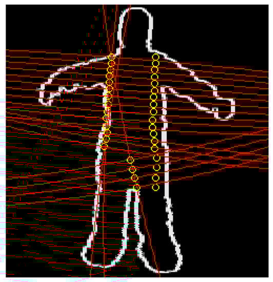 where represents the coordinates of the image points corresponding to the projected 3D model points in the image along all the body parts, using the estimated 3D pose . In order to improve the computing speed, we calculate the geodesic distance according to given direction. Thus, the large circle that passes through the ends of each 3D model cylinder is determined. Then, several circles belonging to the perpendicular planes on this large circle are generated in order to sample the projected 3D model. The points of intersection between these circles and the cylinder contour correspond to the sample points of the projected 3D model (Figure 4). This reduces the number of pixels whose distance from the edge must be calculated. Indeed, unlike the case of perspective images, the complexity of the Distance Map calculation is very high when spherical images are considered.