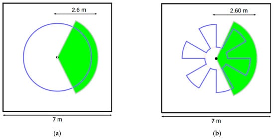 Path Movement for the three sequences. The blue lines correspond to the path followed by the person during his movement around the sensor. The green areas represent the regions where the person is tracked by the SmartTrack system. (a) Sequence 1 and 2, (b) Sequence 3.