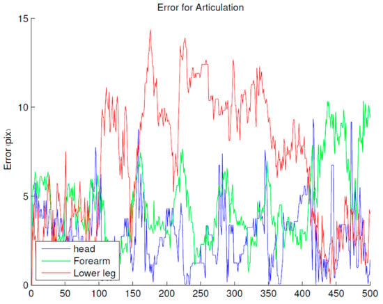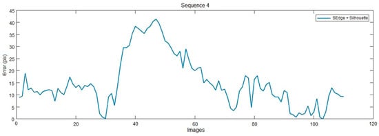 In this section, the effect of the likelihood function on the performance of the proposed 3D tracking algorithm is studied. Thus, four likelihood functions are considered: Spherical Gradient with Geodetic Distance (GG) (defined by Equation (10)), Omnidirectional Gradient (OG), Dual Silhouette (DS) (defined by Equation (11)), and a combination of DS and GG likelihood functions (given by Equation (15)). As a reminder, the likelihood function (OG) uses the classical gradient function (Equation (7)) weighted by the Riemannian metric and calculated on the omnidirectional image. The results obtained when we apply our approach to sequence 1 and 2 demonstrate that GG likelihood function performs better than OG function. It improves the accuracy by 11% compared to the OG function. This demonstrates that handling omnidirectional images in spherical space and using the geodesic distance increases the pose estimation quality. The second result that is clearly seen is that the combination of the likelihood functions DS and GG always gives the best results. Figure 8 shows the obtained results for sequence 4 using DS + GG likelihood function; we found an average error of 15 pixels per image. This is because of the complexity of sequence 4, which presents many self-occlusions of the upper and lower limbs.