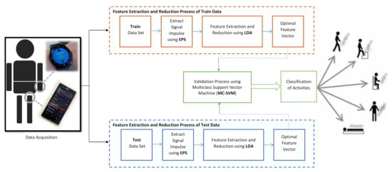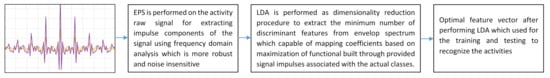 This paper has the target of a low-cost solution model that does not require domain specific knowledge and is able to extract quality features automatically. The EPS and LDA are used for feature extraction based on dimensionality reduction of signal spectrum. Finally, multiclass SVM is used with a view to classify the HAR. Later, the research is arranged in a following manner: Section 2 reviews the related literature; Section 3 represents the proposed scheme of activity recognition in detail; in Section 4, different experiments are performed to evaluate the performance of the proposed method; Section 5 concludes the proposed model.