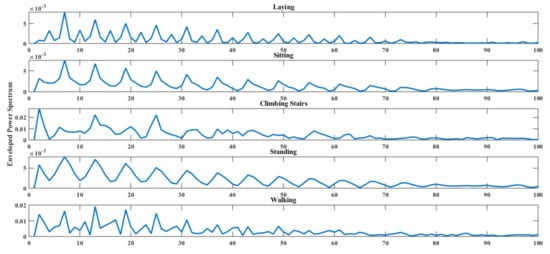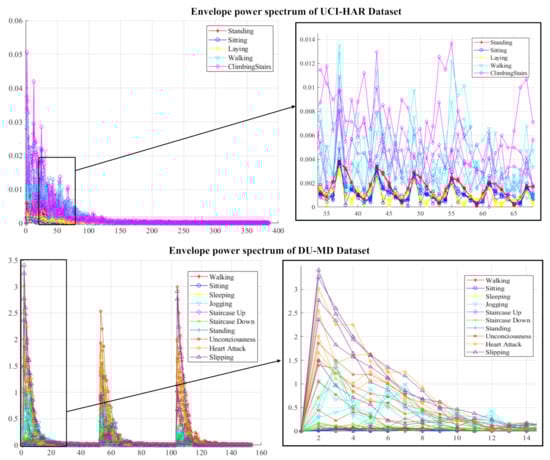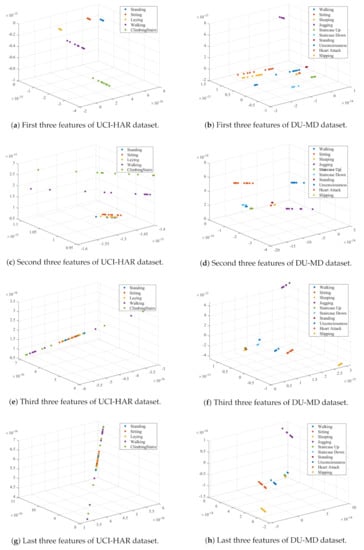 At first, signal impulses are extracted from each activity raw signal using the enveloped power spectrum (EPS). The Enveloped Power Spectrum (EPS) is used for extracting impulse components of the signal using frequency domain analysis which is more robust and noise insensitive. After applying the EPS, 153 and 385 signal spectrums are obtained from 303 and 768 samples of a signal for the DU-MD and UCI-HAR datasets respectively. Figure 8 shows the signal impulses of human activities. The Linear Discriminant Analysis (LDA) is used as dimensionality reduction procedure to extract the minimum number of discriminant features from envelop spectrum. LDA capable of mapping coefficients based on maximization of functional built through provided signal impulses associated with the actual classes. After performing LDA, the feature vectors have become 49 and 123 for each activity signal. In the first order dimension LDA provides discriminant features and are class-wise separable but in the higher order dimension LDA features are not that much discriminative. Figure 9 shows the class-wise features in six subsections for visual representation. Figure 9a,b shows the LDA implanted first three features of each class of the UCI-HAR and DU-MD datasets. It is clearly visible that the first three features of each class are fully separable on a three-dimensional cartesian coordinate system plane. The second three features of each class have a minor over-fitting but still separable for the both datasets which are shown in Figure 9c,d respectively. On the other hand, Figure 9e–h state that these features of for the both datasets are over-fitted between classes and thus those are not separable.