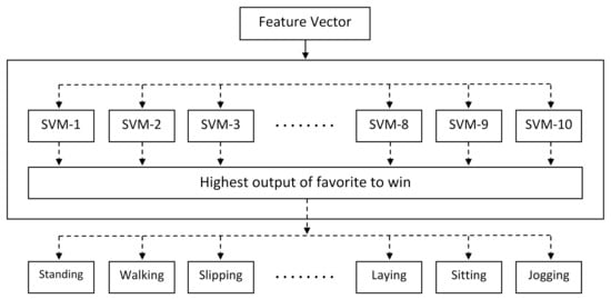 There are few SVM implementations such as follows: one-against-all (OAA), one-against-one (OAO), and one-acyclic-graph (OAG). In this experiment, least complicated multi-class nonlinear classification method (OAA) has been used. The OAA-MCSVM has N SVMs and can work in parallel, as shown in Figure 4. Every SVM distinguishes one class from other classes and lastly a choice can be made by choosing the SVM which comprises the major output value.
