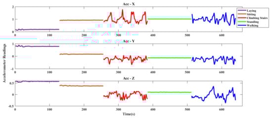Human activity recognition has (HAR) become a fascinating research area for researchers in the field of ubiquitous computing, and human-computer interaction because of its important contribution to monitoring daily human life activities [,,]. It plays a crucial role in a wide range of real-life applications such as healthcare, elder care, smart home, fitness tracking, sports tracking, robotics, social security, industry, and so on [,,,,,,]. Previously, contextual information played a big role in activity recognition []. This contextual information can be captured by placing sensors including cameras in the environment for activity recognition [,]. However, the experiment was conducted on a closed and controlled environment rather than a real daily life activity. Another popular approach is the use of body-worn sensors. This has the advantage that it can be used in both uncontrolled indoor and outdoor environments. Sensors are placed in different places of a body such as chest, wrist and ankle [,] to collect posture information. This method is less user friendly due to the fact that these sensors might cause inconvenience to the users. Moreover, data collection cannot be done surreptitiously in this approach. However, the aforesaid difficulties might be resolved in HAR applications by using smartphone sensors. Sensor embedded smartphones have become a cardinal part of our day to day lives over the last decade. Generally, these gadgets are embedded with versatile sensors such as accelerometers, gyroscopes, GPS, and magnetometers. The data is collected from the embedded sensors while the user performs any kind of daily activity including sitting, standing, walking etc. as long as users carry their phones with them. Thus, smartphone sensors can accumulate date without any additional hardware []. Accordingly, this approach for human activity recognition is appropriate for analyzing user’s daily activities continuously. Among all other inertial sensors, gyroscope and accelerometer are of our interest as human activities can be recorded via these sensors which are embedded in smartphones []. Activity recognition processed by the following consecutive steps including segmentation of data, feature extraction, selection of feature and classifier training []. Out of all the phases mentioned above, extraction of feature is the prime step because of its impact on the accuracy of classifiers []. Extraction of feature from sensory data has always been a challenging task due to the facts such as variable orientation of smartphones, placement and subject, unification of simple activities leading to a complex activity, the characteristics of smartphone sensor signals for the same activity will be different, which will degrade the recognition accuracy to a great extent [,]. One approach is to use hand-crafted features such as spectral entropy, energy of different frequency bands, auto-regressive and FFT coefficients which are used in much researche [,,]. Despite of good performance in practice, domain-specific knowledge and generalization are required []. Thus, to surmount these shortcomings, deep learning-based models have been used in HAR systems to make the feature extraction process automatic [,,,]. Moreover, deep learning model does not totally require manual feature engineering as it is designed to train in an end-to-end fashion. In addition to high accuracy and good generalization, one main advantage of this approach is that after a deep learning model is created, it is trained in an end-to-end fashion which completely removes the need for manual feature engineering [,,]. However, the computational cost required for this approach is infeasible for sensor-based phones with inadequate memory, processing and battery power []. Also, deep learning based techniques need a large number of annotated samples. In future, MobileNets-like systems will make this feasible which is an efficient deep learning models for mobile devices [].