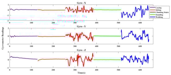 In this dataset, the researchers observed five daily activities of thirty volunteers. The age range of the subjects varies from nineteen to forty-eight (19–48). A waist-mounted smartphone generated the desired data of five popular human activities. These were: walking, laying, sitting, standing and climbing stairs (both upstairs and downstairs). For data generation, smartphone used two sensors: accelerometer and gyroscope. Accelerometer calculated the triaxial linear acceleration and gyroscope calculated the triaxial angular velocity with a constant rate of 50 Hz. The activities were marked manually with the help of recorded video. The full dataset was splitted into two subsets: 70% data were selected for generating training data and rest of the data were chosen for testing. Also, sensor signals were pre-processed and low-pass filters were used for sampling in fixed-width sliding windows of 2.56 s with a 50% overlap where window width is 128. Table 1 shows the class-wise data distribution of the UCI-HAR dataset. Figure 5 and Figure 6 show the triaxial accelerometer and triaxial gyroscope data respectively of a sample activity signal of UCI-HAR dataset.