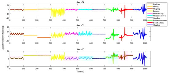 This is also a public dataset. In this dataset, the researchers observed several activities. There were seven basics (Walking, Sitting, Sleeping, Jogging, Staircase Up, Staircase Down, Standing) and three falls (Falling Unconsciousness, Falling Heart Attack, Falling Slipping) activities of thirty-four (34) persons. Each activity has by ten signals for each person with 101 samples. Figure 7 shows the triaxial accelerometer data of DU-MD dataset.