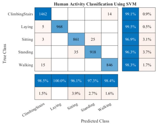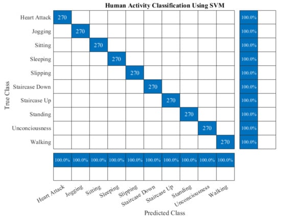 In this experiment, EPS and LDA based feature extraction and reduction model are performed on the raw activity signals for getting the discriminant features. This model uses the two well-known publicly available datasets namely DU-MD and UCI-HAR datasets. These two datasets are branched into two subsets for the training and the testing. For the training purpose, 50% data is used and rest of the data is used for testing. After feature extraction and dimensionality reduction, feature vectors are trained using a conventional and very well-known supervised classifier, specifically, Support Vector Machine (SVM). Though SVM is binary in nature still this classifier can also be used as multiclass classifier efficiently. After completing the training, the performance of the implemented model evaluated by the test data. Classifier is trained and tested for considering different number of features for the both datasets which is shown in Table 2. This experiment illustrates the classification performance increases by using the more features but there exists an optimal number of features where maximum performance is gained. After that, it exhibits an inverse relation between the increasing number of features and classification performance. Table 2 shows the performance of the classifier using different number of features. It is found that the best performance of this experiment is obtained from top five features for the both datasets. The classifier shows 98.67% accuracy and 98.71% F1 score on the UCI-HAR dataset. Similarly, 100% accuracy and 100% F1 score are obtained from the same model on the DU-MD dataset. Figure 10 and Figure 11 show the confusion matrix to visualize the performance of the implemented model in a contingency table on the both datasets respectively. Next, we have applied 3-fold cross-validation on the both datasets to check the robustness of the proposed model. First 2-fold used for training and rest of the fold used for testing purpose. From this experiment, its found that the performance of the proposed model has increased due to the number of training set has increased which is shown in Table 3. Figure 12 shows the class-wise accuracy comparison of the proposed model with other state-of-the-art models on the DU-MD dataset. The class-wise accuracy comparison of the proposed model with other state-of-the-art models on the UCI-HAR dataset is shown in Table 4. The performance comparison of the implemented model with the other state-of-the-art methods are shown in Table 5 and Table 6 as well. From Table 5 and Table 6, it is clear that the implemented model gives superior performance than the other state-of-the-art methods in terms of accuracy and cost.