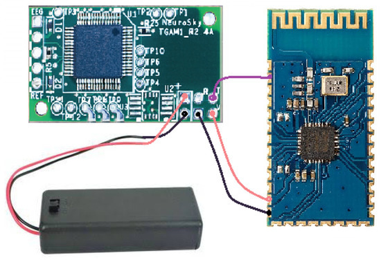 Figure 3 shows the device used as the interface between the brain and the computer called the ThinkGear ASIC Module 1 (TGAM1). TGAM1 is a non-invasive method with a reliability degree of 98%. TGAM1 module is connected directly to a dry electrode, it has an EEG channel with three contacts: EEG, REF and GND. Moreover, it has an incorrect setting signaling that detects through the “Poor Signal” warning if communication with the user’s head should be reestablished, and it is also provided with advanced filtering technology with high immunity to noise [23]. Its low power consumption is suitable for portable battery-powered applications, since its maximum power consumption is 15 mA at 3.3 V.